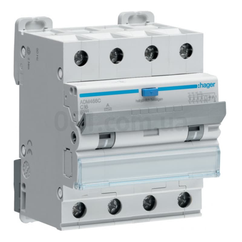 Диференційний автоматичний вимикач Hager ADM466C представляє собою комбінацію ПЗВ і автоматичного вимикача. Завдяки цьому забезпечується надійне відключення всіх полюсів в наступних випадках:при виникненні струму витокупри перевантаженніпри короткому замиканніОсобливостістандарти: EN60898чутливість до змінного і пульсуючого постійного струму витокуномінальний струм витоку 30 мАномінальна напруга 230/400 В, 50/60 Гцхарактеристика Cвідключаюча здатність 6 кАклас селективності 34-полюснийробоча температура від -25°C до +40°Cступінь захисту IP20